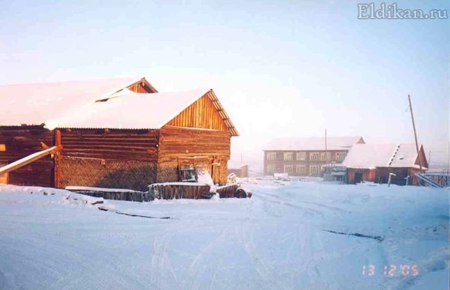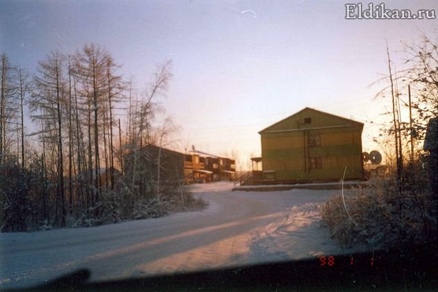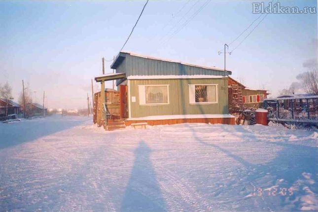 [Виды посёлка] На переднем плане – торец старого здания хлебопекарни (окно подачи было любимым местом местных ребятишек, т.к. с лотка любили собирать поджаристые хлебные крошки). На втором плане – полуразрушенное здание кондитерского, безалкогольного и колбасного цехов. На заднем плане – бывшая контора Ыныкчанского продснаба (с октября 2005 г. – поселковое общежитие).