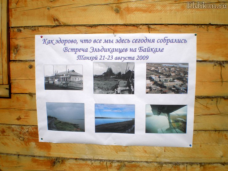 В этой галерее представлены фотографии со встречи земляков-эльдиканцев, прошедшей 21-24 августа 2009 года в посёлке Танхой (Республика Бурятия). Проживание было организовано в гостевых домиках и палатках в местечке «Дулиха». На второй день посетили Байкальский заповедник, - побывали на одном из водопадов, в музее природы и этногородке. Над каждой из фотографий-миниатюр при наведении курсора появляется описание изображения. При щелчке на минифотографии появляется окно Системы Показа Фотографий с поддержкой кнопок управления на клавиатуре «влево» («назад») и «вправо» («вперёд»), а также режима «Показ слайдов» (кнопка старта: Показать слайды, кнопка паузы: Приостановить слайды). Рамкой пурпурного цвета выделены фотографии, появившиеся в последнем обновлении. Для перехода к показу изображений на отдельных страницах, щёлкните на значок Просмотр на отдельной странице в правом нижнем углу минифотографии.