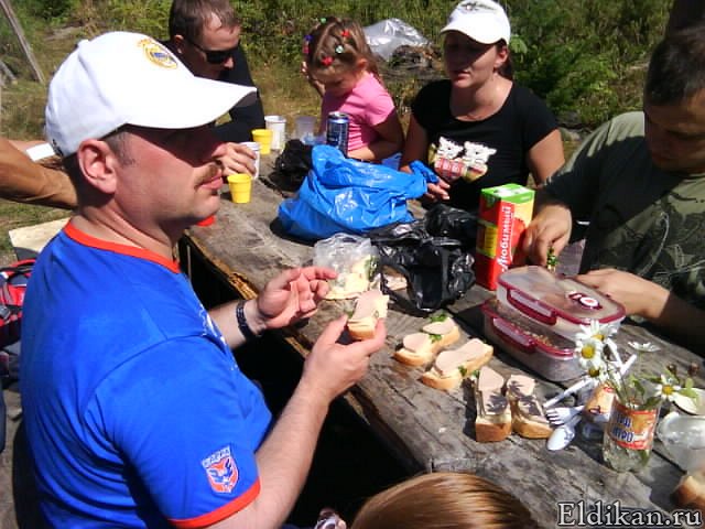 [Встреча-2009 (Танхой)] День второй. Возвращение с водопада. Привал. Сергей на раздаче: «Так.. Кому еще бутербродика? Рекомендую. Колбаска, сыр, укропчик.. Хорошо идет под водочку…»
