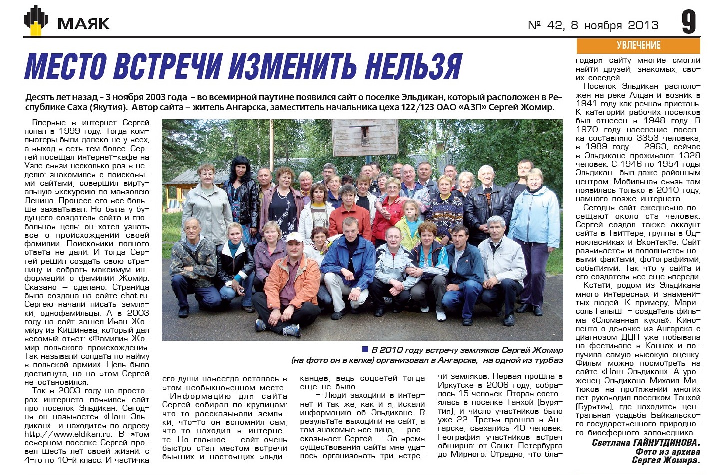 МЕСТО ВСТРЕЧИ ИЗМЕНИТЬ НЕЛЬЗЯДесять лет назад – 3 ноября 2003 года – во всемирной паутине появился сайт о посёлке Эльдикан, который расположен в республике Саха (Якутия). Автор сайта – житель Ангарска, заместитель начальника цеха 122/123 ОАО «АЗП» Сергей Жомир.